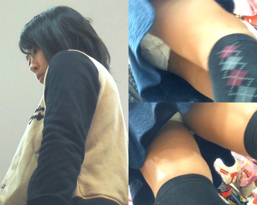 ①コンビニ店内で見つけた私立制服を逆さ盗撮。開脚クロッチ、しゃがみアップの撮影に成功